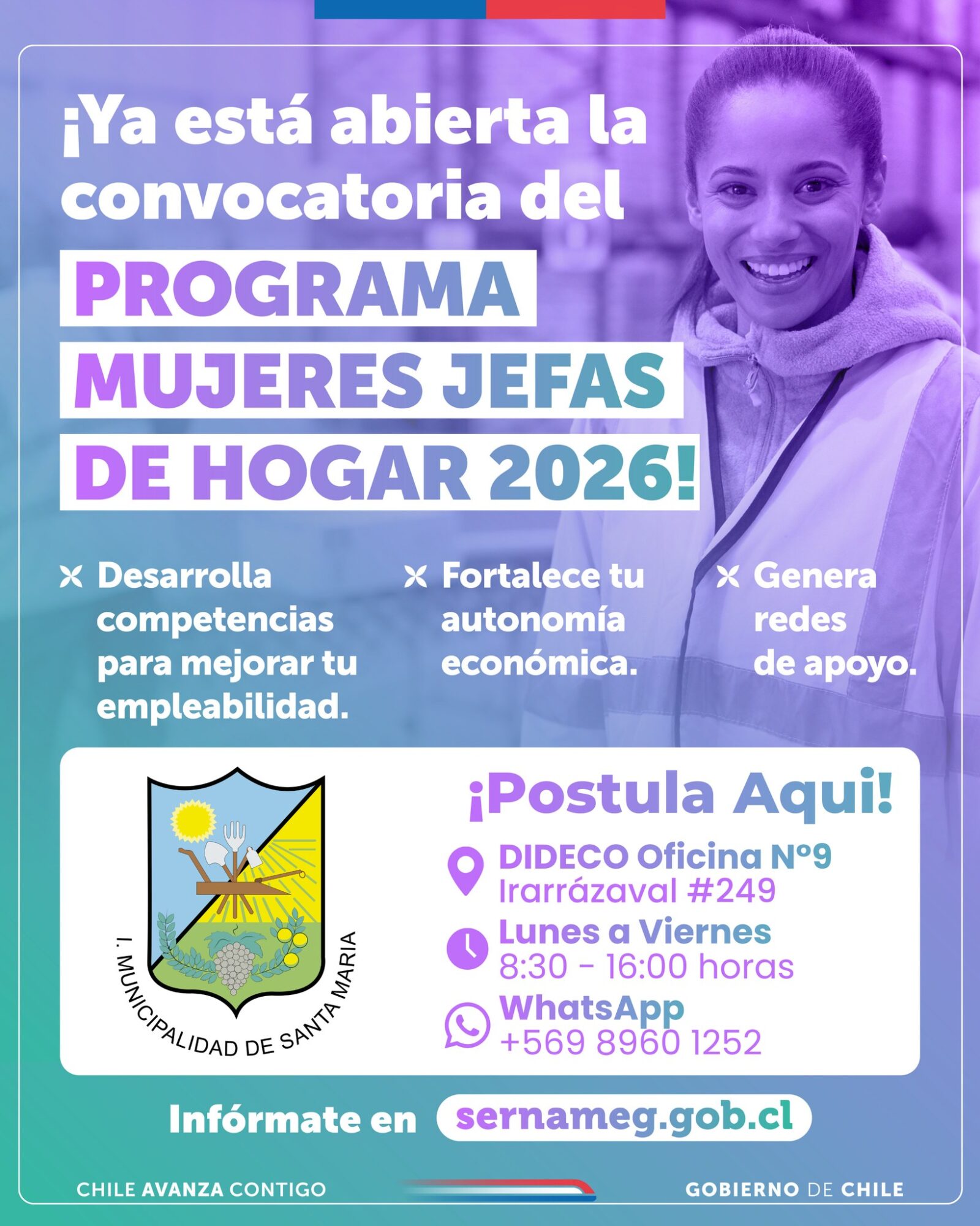 Atención a todas las mujeres de Santa María tanto residentes como aquellas que trabajen aquí, porque en abril próximo se inicia el Programa Mujer Jefas de Hogar, cuyo principal enfoque es mejorar el rendimiento económico de ellas ya sea mediante una capacitación laboral, así como también aprender a hacer currículum o preparar una entrevista de trabajo.